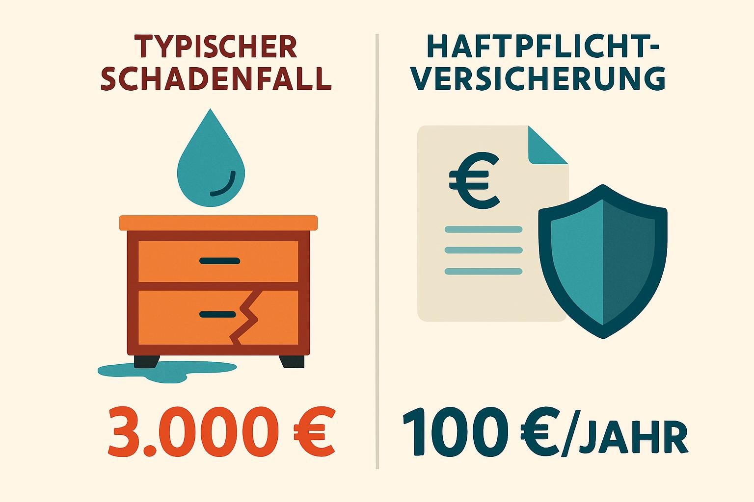 Viele unterschätzen die finanziellen Risiken eines Schadens: Ein kleiner Unfall oder ein Wasserschaden kann schnell mehrere tausend Euro kosten. Die Kosten für eine Haftpflichtversicherung sind im Vergleich dazu gering – bereits ein günstiger Tarif deckt Schäden ab, die deine Ersparnisse sonst massiv belasten würden. So zahlst du wenige Euro im Monat und sparst im Ernstfall enorm.